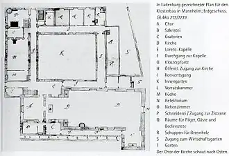 Der Klosterkomplex mit einem großen Innengarten schloss sich südlich an die Kirche an. Letzterer hat sich, als sogenannter „Scipiogarten“, bis heute als Grünanlage erhalten. Die Kirche besaß eine Gruft, in der u. a. der kurpfälzische General Franz Fortunat von Isselbach (1663–1734) ruhte. Sein Epitaph befand sich in der Kirche, die Inschrift wird im „Thesaurus Palatinus“ des Johann Franz Capellini von Wickenburg überliefert.[4]