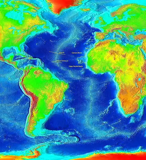 - ↑ Williams, C. A. U. a.: Fracture zones across the Cape Verde Rise, NE Atlantic. In: Journal of the Geological Society. Band 147. London 1990, S. 851–857.