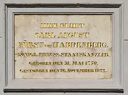 Gemeinsam mit Wilhelm von Humboldt und Stein entwickelte er 1814 einen Entwurf für eine Bundesverfassung. Am 3. Juni desselben Jahres erhob ihn Friedrich Wilhelm III. in Paris in den Fürstenstand und schenkte ihm die Standesherrschaft über das Amt Quilitz, das in Neuhardenberg umbenannt wurde.[80] 1820 bis 1823 baute Karl Friedrich Schinkel das ursprünglich barocke Schloss im Auftrag des Fürsten klassizistisch um.