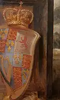 Links und rechts von der Bogenöffnung befinden sich die anderen beiden Zonen, die im oberen Abschnitt von wogenden grünen Draperien und von kannelierten Säulen mit Basis beherrscht werden, die dem Triumphbogen vorgesetzt sind. Links unten im Vordergrund ist ein Schild an das Podest der Säule angelehnt. Auf dem Schild abgebildet ist das Wappen Schottlands, das Wappen Irlands und zweimal das Wappen Englands, das sich aus vier Feldern mit jeweils drei Lilien und drei Löwen zusammensetzt. Der große rote Löwe ist das Wappentier Schottlands und wird von einem Doppellilienbord umrahmt. Die keltische Harfe ist das traditionelle Wappen von Irland.