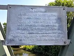 - Gedenktafel an der Hafenbahnbrücke in Halle, wo der Mord geschah