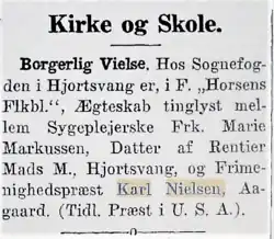 Dieser Neuen Freikirche diente er von 1930 bis 1939 als Pastor.[15] 1933 heiratete er in Hjortsvang (in der Nähe von Horsens und rund 35 Kilometer von Ågård entfernt) seine zweite Ehefrau, Marie Markussen.