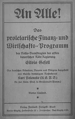 - An Alle! Das proletarische Finanz- und Wirtschaftsprogramm des Volksbeauftragten der bayerischen Räterepublik Silvio Gesell. Den deutschen Arbeitern und Bauern dargestellt von Gesells Rechtsbeirat Karl Polenske. Verlag Freiland-Freigeld-Bund: Berlin-Steglitz 1919