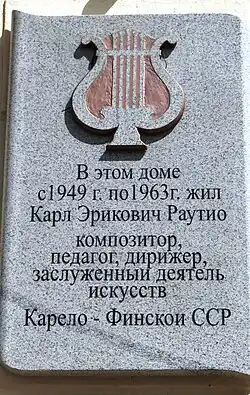 Die Gedenktafel für Karl Erikowitsch Rautio wurde am Gebäude in der Kirow-Str. 24 installiert. Sie trägt die Aufschrift: „In diesem Haus wohnte von 1949 bis 1963 der Komponist, Dirigent, Verdienter Arbeiter der Künste der Karelisch-Finnischen SSR“.