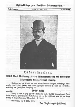 Am 6. Februar 1906 traf ein Kriminalbeamter in der Schönhauser Allee in Berlin auf Hennig, von dem bekannt war, dass er dort Kontakte zu Frauen unterhielt. Hennig konnte sich der Festnahme entziehen, indem er den Beamten mit einer Pistole vor der Tür eines Polizeireviers niederschlug. Die Beamten im Revier nahmen die Verfolgung auf und umstellten ein Haus, in das Hennig geflohen war. Der Gesuchte entkam über das Dach in ein Nachbarhaus. In der Folge wurde zwar Hennigs Wohnung aufgefunden und durchsucht, ebenso eine nahe Kleingartenkolonie sowie die Umgebung der Schönfelder Allee und der Kopernikusstraße. Gefunden wurden lediglich Papiere des Ermordeten in der Wohnung Hennigs. Es kam in der Folge noch zur Verhaftung zweier Personen, die irrtümlich für Hennig gehalten wurden. Hennig bot dem Berliner Lokal-Anzeiger seine Lebensgeschichte zum Kauf an. Dieser ging zum Schein auf das Angebot ein und bot 1700 M, tatsächlich wurde aber die Polizei unterrichtet. Hennig entfernte sich vom Übergabeort, da er Verdacht geschöpft hatte.[1] In der Folge wurde die Belohnung auf die Ergreifung Karl Rudolf Hennigs von ursprünglich 500 auf 3000 M erhöht.