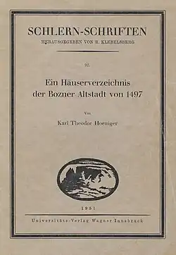- Ein Häuserverzeichnis der Bozner Altstadt von 1497 (= Schlern-Schriften. Band 92). Wagner, Innsbruck 1951. Auch als: Veröffentlichungen des Tiroler Landesmuseums Ferdinandeum. Band 31, ebd. 1951, S. 309–356 (zobodat.at [PDF]).