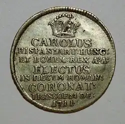 Die Lage änderte sich, als sein Bruder Joseph, inzwischen Kaiser, 1711 ohne männlichen Nachkommen verstarb. Karl fielen als Erbe nun auch Österreich, Böhmen, Ungarn und die Aussicht auf den Kaisertitel zu. Bedrängt von Wiener Kreisen, kehrte er nach Wien zurück, ohne den Anspruch auf den spanischen Thron aufzugeben. Demonstrativ ernannte er bei seiner Abreise aus Spanien seine Frau zur Statthalterin in Spanien. Am 12. Oktober 1711 wählten ihn die Kurfürsten zum römisch-deutschen König. Am 22. Dezember 1711[6] wurde er in Frankfurt am Main zum Kaiser gekrönt. Seit Anfang 1712 befand er sich wieder in Wien; bei seiner Rückkehr am 26. Jänner 1712 ertönte die Alte Pummerin des Stephansdoms in Wien zum ersten Mal.[7] Im selben Jahr wurde er zum König von Ungarn gekrönt. Angesichts der drohenden Vereinigung von Österreich und Spanien in einer Hand verließen ihn seine Alliierten im Spanischen Erbfolgekrieg, so dass er auf die spanische Krone verzichten musste. Barcelona hielt er noch ein Jahr.