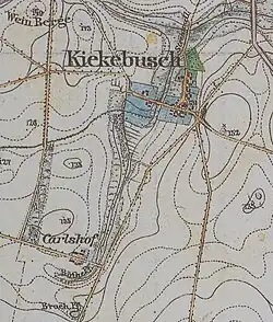 Am 30. August 1842 brannte das Rittergut bzw. das Gutshaus und ein Teil des Ortes Kiekebusch nieder. Das Gutshaus im Ort wurde nicht mehr aufgebaut, stattdessen wurde 1843/1844 südwestlich des Ortskerns auf der Gemarkung Kiekebusch ein neues Hofgut und Pächterhaus errichtet, das 1844 offiziell benannt wurde. Auf S. 294 des Amtsblattes heißt es Carlshof, im Index dagegen ist das Vorwerk Karlshof geschrieben.[1] In der weiteren Folge setzte sich die Schreibweise Karlshof durch. Der Hof wurde mutmaßlich nach Karl Friedrich Ackermann benannt, der zu dieser Zeit Oberamtmann des Amtes Rotzis war. Ab 1847/48 wurde das Amt Rotzis an Gustav Friedrich Julius Trieglaff vergeben, der einen Pachtvertrag bis 1874 erhielt[2][3] und somit auch Pächter von Karlshof war. Um 1860 gab Gustav Friedrich Julius Trieglaff seinen Pachtvertrag auf, und die beiden Vorwerke Rotzis und Karlshof wurden getrennt verpachtet.