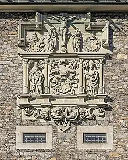 Das Relief wurde vom Steinmetzen Baltus von Seilmannsweiler (Salem) geschaffen. Im oberen Teil befindet sich eine Darstellung der Kreuzigung Jesu, mit Maria und Johannes an seiner Seite. Flankiert wird die Szene von den Wappen von Papst Pius IV. Medici und dem Reichswappen Kaiser Maximilians II. als Zeichen der Reichsfreiheit der Abtei.