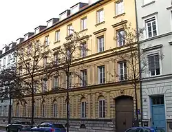 - Karlstraße 21: zweiflügeliger palastartiger Eckbau,[8] ehemaliges stattliches Mietshaus (Zinspalast) mit Frohsinns-Saal, jetzt Finanzamt für Körperschaften (Denkmalliste D-1-62-000-3250), 1829 von Joseph Höchl (nur die durch Risalite gegliederte Fassade in Klenzes florentinischem Neurenaissancestil original[9]), in der NS-Zeit Hauptamt für Volksgesundheit der NSDAP, NSD-Ärztebund e.V.[10]