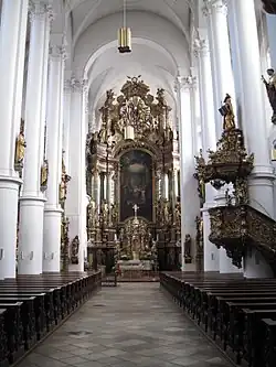 Das Ölbild des Hochaltars (1741) von Michelangelo Unterberger zeigt die Aussendung des Heiligen Geistes an Pfingsten. Das 21 m hohe Altarretabel wurde von Joseph Matthias Götz entworfen. Von ihm stammen auch die ca. 3 m hohen Figuren (von links: Papst Telesphorus, Prophet Elija, Prophet Elischa und Papst Dionysius). Der Auszug zeigt die auf das Altarbild bezogene Darstellung der Dreifaltigkeit; links steht der Märtyrer Angelus der Karmelit, rechts Albertus Siculus. Die freistehende Altarmensa mit Tabernakel zählt zu den Glanzleistungen von Joseph Matthias Götz. Die Rückseite des Altars ist ebenfalls mit einer Pfingstdarstellung bemalt (1675).