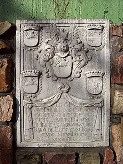 - ↑ Der Schild war nach der Renovierung Ende der 1980er Jahre zunächst nicht mehr auffindbar, wurde jedoch 2020 in Einzelteilen wieder aufgefunden, zusammengesetzt, restauriert und in der Kirche aufgehängt