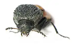 Der aufgeblähte Halsschild trägt oberseits raspelartige Zähne, die vorn seitlich besonders markant ausgebildet sind. Die Form der Zähne variiert jedoch individuell und nutzt sich im Alter ab. Halsschild, Brust und erstes Sternit sind schwarz.