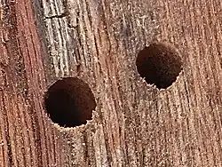 Die Larven entwickeln sich in hartem totem Holz. Sie bohren dort großvolumige Gänge, die sich beliebig kreuzen. Die Bohrgänge sind dicht mit dem sehr feinen Bohrmehl gefüllt. Die Entwicklung kann abhängig vom Angebot an Nährstoffen mehrere Jahre dauern,[8] im Regelfall dauert die Entwicklung der Larve jedoch 11 Monate. Da mehrere Generationen hintereinander das gleiche Holzstück bewohnen können, kann dies in seinem Innern vollständig zu Bohrmehl zernagt werden. Die Ausschlupflöcher sind kreisrund (Abb. 4).