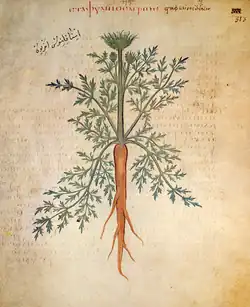 Die ältesten Belege über eine Nutzung von wilden (Daucus carota L.) und kultivierten (Daucus carota subsp. sativus Hoffm. Schübl. & G. Martens)[20] Möhren stammen aus der Antike Griechenlands und Roms. Dioskurides nannte um 60 n. Chr. die Wilde Möhre staphylinos und erwähnte ihre Nutzung als Arzneipflanze (gegen Geschwüre, menstruationsfördernd, fruchttötend, gegen Brustfellentzündung, Ödeme und giftige Substanzen sowie Harnverhalt[21]).[22] Sie sei wirksamer als die im Garten gezogenen Pflanzen. Die Abbildung in der Dioskurides-Ausgabe des 6. Jahrhunderts ist die älteste bekannte Abbildung. Dioskurides erwähnt auch, dass staphylinos bei den Römern carota und pastinaca genannt werde. Bei römischen Autoren ist durch die vielfältigen Bezeichnungen häufig nicht klar, ob sie von der Karotte oder der Pastinake schreiben, und auch die Kretische Augenwurz („Daucus cretensis“)[23] sowie andere Umbelliferen[24] kommen dabei in Frage.