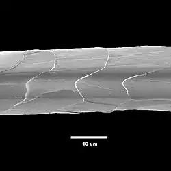 Kaschmirwolle kann durch verschiedene mikroskopische Verfahren von anderen Tierhaaren unterschieden werden. Dadurch lässt sich auch der Anteil an Kaschmirwolle in einer Mischung von Fasern bestimmen. Überdies existieren automatisierte Bildanalysen mikroskopischer Aufnahmen.[26] Die Haaroberfläche ist geschuppt, mit 6–7 Schuppen pro 100 μm Haarlänge.[27] Der Haarquerschnitt der dünneren Wollhaare ist rund und besitzt einen typischen Durchmesser von 15 μm.[27] Im Querschnitt der dickeren Wollhaare sind Epidermis, Cortex und Medulla gut zu erkennen, allerdings fehlt bei dünneren Haaren die Medulla.[28] Bei Wollhaaren mit größerem Durchmesser ist die Schuppenlinie mosaikförmig unterbrochen und der Querschnitt eher oval.[28]