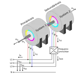 Die Ständerwicklung 1 wird mit dem Netz verbunden und gibt die generatorische Leistung direkt in das Netz ab.[7] Die Ständerwicklung 2 ist mit dem Umrichter verbunden und gibt je nach Drehzahl elektrische Leistung an den Umrichter ab oder nimmt vom Umrichter Leistung auf. An das Netz wird die resultierende Leistung: