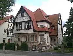 Die in den Formen des späten Jugendstils und unter Einfluss englischer Landhaus-Architektur erbaute Villa besteht aus einem zweigeschossigen Hauptbaukörper mit Anbauten und einem hohen Walmdach. Zur Straße ist ihm ein nur eingeschossiger Flügel mit weit heruntergezogenem Mansarddach vorgelagert. Dieser Flügel hat im Erdgeschoss zwei in Werkstein gearbeitete, halbelliptische Fenstererker (Bay Windows), zwischen denen sich eine kleine Balkonnische befindet. Der darüberliegende verputzte Giebel kragt zweimal vor und hat ebenfalls Fenstererker, die hier jedoch etwas kleiner und in Holz gearbeitet sind. An der Westseite befindet sich ein zweiter Giebelanbau mit Eingangsloggia und Treppenhaus. Sein Dach ist geschwungen und noch tiefer als am Straßengiebel heruntergezogen. Die Giebelspitze trägt hier ein leicht vorkragendes Sichtfachwerk.