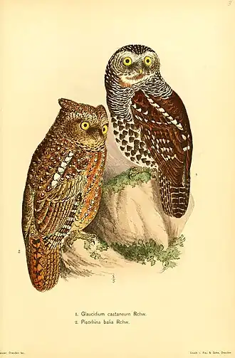 Kastanienzwergkauz in: Ant. Reichenow: Die Vögel Afrikas. Atlas, Neudamm, Verlag von J. Neumann, 1902 | ||||||||||