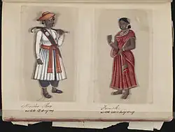 Eine Seite einer Handschrift von 1837, in der „72 Arten von Kasten in Indien“ illustriert werden. Dargestellt sind Männer und Frauen aus der Gegend von Madurai.