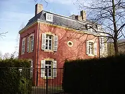 Die Fassaden sind auf den gegenüberliegenden Seiten symmetrisch gestaltet und erhielten ihr Aussehen im Stil Louis-quinze/Louis-seize durch Umbauten um das Jahr 1775. Hochparterre und Obergeschoss besitzen an den Längsseiten je fünf große Rechteckfenster mit Rahmungen aus behauenem Blaustein.[19] Zum mittig gelegenen Eingang an der Westseite führt eine zweiläufige Treppe mit schmiedeeisernem Geländer im Louis-seize-Stil hinauf. Die Ostseite des Hauses ist durch eine große Terrasse mit Balusterbrüstung betont. Sie kann vom Garten über eine große zweiläufige Freitreppe erreicht werden und bietet einen guten Blick auf die in unmittelbarer Nähe gelegenen Fischweiher.