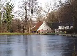 Das Herrenhaus liegt an mehreren kleinen Weihern, die in einen sechs Hektar[16] großen Landschaftsgarten nach englischen Vorbildern eingebettet sind. Sie entstanden im 16. Jahrhundert[17] durch das Anlegen von Dämmen und Aufstauen des Strijthagerbeeks. Am Rand des nördlichsten Weihers steht dabei die als Getreidemühle errichtete Wassermühle, die Strijthagenmolen genannt wird. Sie stellte ihren Betrieb um 1950 ein und wurde 1989 umfassend restauriert.[8]