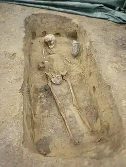 Ein weiteres Gräberfeld befindet sich im Bereich des Hauptplatzes von Schwechat, da dort eine Reihe spätantiker Bestattungen gesichert werden konnte. Einer der ältesten dokumentierten Funde ist ein römisches Skelettgrab, das 1923 am Hauptplatz 5 aufgefunden wurde.[36] Weitere vier römische Gräber wurden 1927 (ebenfalls am Hauptplatz) durch M. Müllner beschrieben.[37] Im selben Jahr wurde im Hof des damaligen Bezirksgerichts (heute Bezirkshauptmannschaft) ein römerzeitliches Grab mit verschiedenen Gefäßen gefunden.[34] Am 31. März 1933 deckte J. Ableidinger in der südöstlichen Ecke der Hammerbrothütte ein römisches Steinplattengrab auf. Es handelte sich dabei vermutlich um ein Reitergrab aus dem frühen 4. Jahrhundert, zumindest weisen die neben den Skelett eines etwa 35-jährigen Mannes gefundenen Grabbeigaben, ein Hufeisen, eine eiserne Schnalle, ein Messer sowie einige Pferdezähne, darauf hin. Für dieses Grab war ein Grabstein aus der 2. Hälfte des 3. Jahrhunderts als Abdeckung verwendet worden.[38] Das Reitergrab wurde restauriert und konserviert und in der Eingangsaula des Bundesgymnasiums/Bundesrealgymnasiums aufgestellt. E. Neumann berichtete 1950 vom Fund mehrerer Gräber und goldener Ohrgehänge bei einer Grundaushebung im Zuge der Beseitigung von Kriegsschäden am Hauptplatz 21 und 21a. In diesem Zusammenhang wurde am Hauptplatz 23 auch ein spätrömischer Sarkophag geborgen.[39]