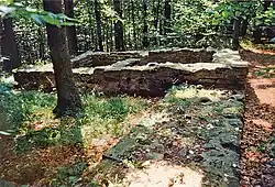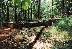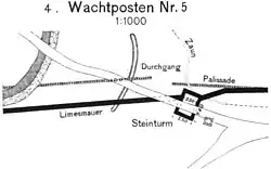 | Wp 14/5[21] | „Am Ostabhang des Vorderen Schloßbuck“ | ![]() ![]() Dieser 5,5 × 7,4 Meter große Turm wurde nur 65 Meter von Wp 14/4 entfernt errichtet und liegt am Osthang des Bergrückens. Auch bei ihm fand 1980 die Nachuntersuchung und anschließende Teilrekonstruktion mit Konservierung statt. Dabei wurde eine fehlerhafte Aufnahme des 1887 erstmals durch Eidam ergrabenen Bauwerks ins ORL festgestellt, da der Turm nachträglich und ziemlich schiefwinkelig in die bereits bestehende Limesmauer gebaut worden ist, wobei die Grenzmauer teilweise abgetragen werden musste. Westlich des Turms fand sich in der Palisade, jedoch nicht in der Steinmauer des Limes, ebenfalls ein Durchgang. Das Fundament eines kleinen, westlich gelegenen quadratischen Baus ist nicht mehr zu sehen. 2007 wurde das Turmfundament vollständig saniert. Auf der nun folgenden, rund 500 Meter langen Strecke ist die Mauer nur in geringen Resten sichtbar; erst danach tritt sie als Schuttwall wieder deutlicher hervor. 15 Meter südlich der Mauer liegt nun das Kleinkastell Hinterer Schloßbuck. Um Sichtverbindung mit Wp 14/4 zu haben, muss dieser Turm mindestens fünf Meter hoch gewesen sein. |