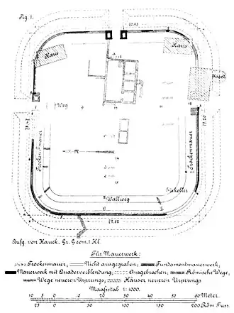 - zwischen 140 und 150 das Trockenmauerwerk durch eine gemörtelte Steinmauer ersetzt worden.[5]