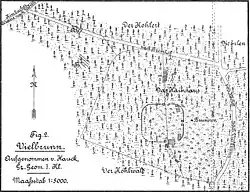 | Bauweise | c) Holz-Erde-Lager (vermutlich) b) Trockenmauer c) Mörtel-Steinmauer |