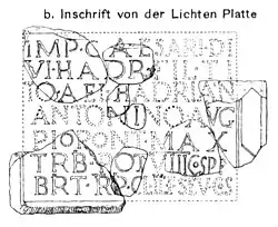 | Wp 10/19 | „An der Lichten Platte“ | ![]() In etwa 35 m Entfernung befand sich die Steinturmruine, die jedoch 1842 beim Bau der Straße von Eulbach nach Vielbrunn abgebrochen wurde. Eine planmäßige archäologische Untersuchung fand nicht statt, jedoch konnten bei den Abbrucharbeiten Fragmente der ursprünglichen Bauinschrift[17] geborgen werden. Dieser zufolge wurde der Turm im Jahre 146 n. Chr. durch eine Einheit der triputiensischen Brittonen errichtet. Die ursprüngliche Größe der Inschriftenplatte betrug 58 cm mal 80 cm bei einer Dicke von etwa 15 cm. Die Fragmente befinden sich heute in den gräflichen Sammlungen des Erbacher Schlosses.[18]