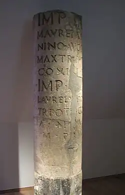 - IMP(eratori) CAES(ari)/ M(arco) AVREL(io) ANTO/NINO AVG(usto) PONT(ifici)/ MAX(imo) TR(ibunicia) POT(estate) XVI/ CO(n)S(uli) I[I]I ET/ IMP(eratori) [C]AES(ari)/ L(ucio) AVREL(io) [VE]RO AVG(usto)/ TR(ibunicia) POT(estate) [II] CO(n)S(uli) II/ A M[---] A E C/ M(ilia) P(assuum) XII (VII?)