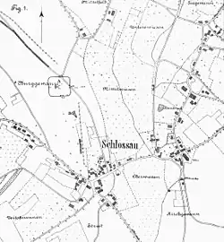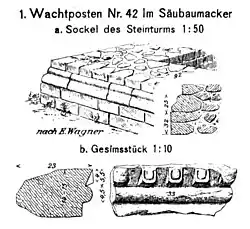 | Wp 10/42 | „Im Säubaumacker“ | ![]() Von Wilhelm Conrady wurde 1883 ein quadratischer Steinturm mit einer Seitenlänge von 5,60 m nachgewiesen.[20] Karl Zangemeister berichtete in diesem Zusammenhang von fein gearbeiteten Gesimsstücken.[21] Luftbildaufnahmen aus dem 20. Jahrhundert schließlich zeigen die dunkle Verfärbung des Ringgrabens eines Holzturmes.[19] |