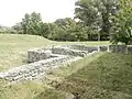 Mócsy untersuchte in den 1950er Jahren die zugänglichen Abschnitte der Verteidigungsanlage im Südosten. Die Wehrmauer zwischen dem südlichen Tor, der Porta principalis dextra, und dem am Flussufer gelegenen südöstlichen Eckturm besaß ein 0,85 Meter breites Kernmauerwerk, dem an der Außenseite eine Schaufront von 0,2 × 0,4 Meter großen Handquadern vorgeblendet worden war. Die durch einen Mittelpfeiler (Spina) geteilte, zweispurig ausgebaute Porta principalis dextra besaß an ihren beiden Flanken je einen um seine halbe Breite aus dem Mauerverbund hervorkragenden rechteckigen Torturm, dessen Grundfläche 3,2 × 4 Meter maß.[9] Weit hervorspringende Türme werden erst ab der Mitte des 2. Jahrhunderts in der römischen Militärarchitektur immer stärker zur üblichen Norm. Durch zusätzliche, in die hervortretenden Torbauten integrierte Schießfenster konnten beispielsweise die Zugänge besser beobachtet und verteidigt werden.[21] Das Südtor wurde im Gegensatz zu einigen Nachbarkastellen und anderen bekannten Lagern nicht nachträglich vermauert.