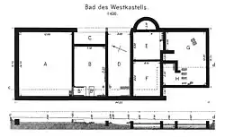Etwa 100 Meter leicht hangabwärts und südöstlich der Porta praetoria befand sich in der Flur „Brühl“ das bei seiner Aufdeckung 1896 gut erhaltene 16 × 44 Meter große Reihenbad des Westkastells. Mit Apodyterium (Auskleideraum), Frigidarium (Kaltwasserbad) mit Badebecken, Tepidarium (Warmluftraum), Caldarium (Warmwasserbecken) und einem großen Praefurnium (Heizraum). Dort wurde die Luft für die Hypokaustheizung erwärmt.