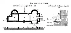 Das zweite Bauwerk aus Stein, das bis heute in der Wehranlage gefunden worden ist, liegt mitten im südöstlichen Karree der durch zwei kreuzförmig angelegte Straßenachsen durchteilten Lagerfläche. Aufgrund der Raumgestaltung und des Grundrisses kann er als römisches Bad angesehen werden. Die ungewöhnliche Lage des Bades mitten im Lager und der damit verbundene Raumverlust für die Truppe deutet, wie beim spätantiken Bad im Kastell Eining bezeugt, eher auf eine nachkastellzeitliche Erbauung und Nutzung hin. Da nähere Untersuchungen fehlen, wurde bereits spekuliert, ob das verlassene Lager nach dem Limesfall, im fortgeschrittenen 3. Jahrhundert, nicht zum Ort eine Villa rustica geworden ist.