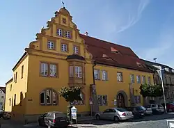 Der Kastenhof ist ein zweigeschossiger, verputzter Massivbau mit einem Satteldach und einem geschwungenen, renaissancezeitlichen Treppengiebel. Er besitzt dreigeschossige Sandsteinlaibungen, Strebepfeiler und einen Erker. Nach dem Stadtbrand von 1572 wurde das Gebäude auf spätmittelalterlichen Bauteilen neu errichtet. 1903 fand eine teilweise Erneuerung des Volutengiebels und eine Erweiterung des Gebäudes nach Süden statt. Zusammen mit dem Gebäude Stadtplatz 38, dem ehemaligen Bezirksamtsgebäude, wurde eine Dreiflügelanlage gebildet, ein zweigeschossiger Massivbau mit einem Satteldach, einer vorgeblendeten Werksteinfassade, einem Mittelrisalit und einer einfachen Fassadengliederung. Dieser Gebäudeteil wurde 1823 errichtet und um 1900 überformt; er wird heute als Rathaus verwendet.