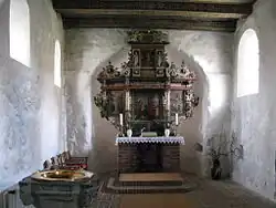 Die Innenausstattung stammt überwiegend aus dem 15. bis 17. Jahrhundert. Ältestes Einrichtungsstück ist die spätgotische Taufe aus sogenanntem blauem Marmor. Dieser dunkle Kalkstein wurde in Namur (heute Belgien) gefertigt. Die Taufe hat die Form eines achteckigen Pokals mit vier hervorspringenden Köpfen, die wahrscheinlich die vier Paradiesströme oder die Evangelisten symbolisieren. In der Kuppa befindet sich ein fest installiertes Taufbecken aus Kupfer, das heute aber durch ein nachträgliches aufgesetztes Bronzebecken verdeckt ist. Ähnliche Taufen stehen in Ockholm und Uelvesbüll in Nordfriesland.