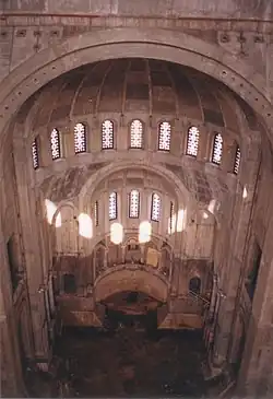 Im letzten Schritt wurde unter der Kuppel auf Bodenhöhe das Pendentif zusammengebaut. Es stellt das Übergangselement zwischen dem quadratischen Grundrissplan des Kirchenraums zum kreisförmigen Element der Hauptkuppel dar. Durch Anbringung des Pendentifs unterhalb der Kuppelöffnung in 40 m Höhe erhielt der Raum seine abschließende abgerundete Form. Die Aufgabe des Pendentifs besteht in der Unterstützung der Hauptkuppel in vier Positionen durch hydraulische Heber, die jeweils 3.000 kN Kraft (zusammen 12.000 kN) aufbringen und weitere Gewichte, die durch aufgetragenen Mörtel, Natursteinverkleidung der Außenfassade sowie die über 40 Tonnen schweren Gold-Mosaiken der Kuppel entstehen, abfangen. Das 1.100 Tonnen schwere und 14 m hohe Pendentif besitzt eine rechtwinkelige Basis, von jeweils 24 m Spannweite zwischen den Jochen. Es wurde als dauerhaftes Befestigungselement per „Chains“-Methode in seine endgültige Position unter die Kuppel 28 m hoch gezogen und dort befestigt.[80] Während der insgesamt zwei Tage dauernden Prozedur Ende Januar 1990 realisierte man in nur 36 h eine Geschwindigkeit von 2,0 m/h.[81] Das Pendentif wurde ebenfalls mit einer minimalen Toleranz, die deutlich weniger als die erforderlichen 5 cm betrug, an ihren Platz gebracht.