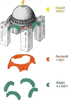 Als Vorarbeit der Hauptaufgabe der Kuppelhebung wurden die vier je 400 Tonnen schweren Paare der 24 m überbrückenden Jochbögen zwischen den vier Tragsäulen im Zeitraum von Januar bis Juni 1988 fertig montiert. Dabei wurden sie auf sogenannten „Chains“ in die Luft gezogen, wo sie so lange hängen blieben, bis unter diesen die tragenden vertikalen Elemente der Säule für sie gegossen waren. Danach erst wurden sie aus den „Chains“ entlassen, sodass Kuppeljoche und Säulen eine portalartige Struktur bildeten.[74] An den Außenseiten der vier Joche wurden im selben Jahr die vier Halbkuppeln mit 24 m Breite und Doppelschale aus acht Stahlbetongittern durch Einsetzen von Stahlbetonplatten und In-situ-Zusammenfügen ebenso aus vorgefertigten Montageelementen zusammengesetzt.