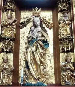 Das älteste Ausstattungsstück des Domes ist das als Rundbild gemalte Epitaph des 1426 verstorbenen Domherrn Bartholomäus Boreschow,[2] ein Beispiel der Malerei des Schönen Stils unter böhmischem Einfluss. Aus dem späten Mittelalter ist ebenfalls der ehemalige Hochaltar des Domes erhalten. Die mittlere Szene dieses Pentaptychons (Fünfflügeliger Altar) stellt Maria mit dem Jesuskind in Anlehnung an die Offenbarung des Johannes dar (Offb 12,1-5). Maria, vor dem goldenen Hintergrund der Sonne, trägt Jesus als den neuen oder „letzten Adam“, den himmlischen Menschen, auf den Armen (1 Kor 15,45). Sie steht auf einer Mondsichel, die das Gesicht des sterblichen, irdischen „ersten Adams“ zeigt. Unter der Mondsichel sind die Windungen eines Schlangenleibes sichtbar. Zu beiden Seiten des Altars befinden sich Bildnisse der Kirchenväter. Der Altar wurde im Auftrag des Bischofs Lucas Watzenrode 1504 von einer Thorner Werkstatt geschaffen.[3] Er steht im Nordschiff des Langhauses.