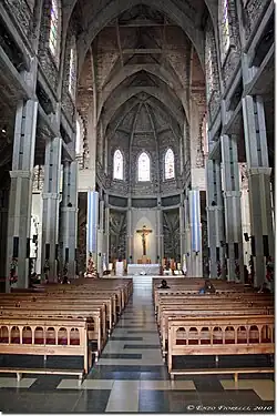 Ein ca. 50 m hoher Glockenturm mit gezimmertem und mit Schiefer verkleidetem Spitzhelm überragt das Bauwerk. Das Innere ist dreischiffig, basilikal und besitzt ein Querhaus; die Pfeiler sind betonsichtig. Im Mittelschiff finden sich Schwibbögen, auf denen eine Flachdecke ruht; in den Seitenschiffen finden sich Strebebögen. Die Fenster sind im Scheitel angespitzt, auf Maßwerk wurde jedoch verzichtet.
