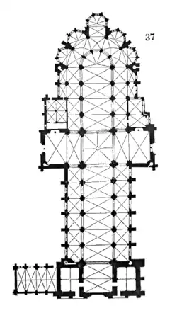 Das Querschiff ist mit einem Massiv gekrönt, das eine quadratische, von zwölf Chimärenfiguren bewachte Plattform in zehn Metern Höhe über der Vierung trägt. Darauf erhebt sich ein oktogonaler, hochgotischer Vierungsturm, der eine ehemals vorhandene Kuppel ersetzte. Hauptschiff und Chor stützt ein umfangreiches Strebewerk aus rundumlaufenden, freistehenden Strebepfeilern.