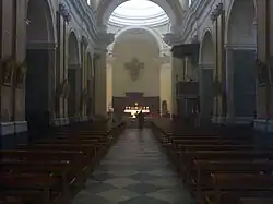 Die dreischiffige Basilika besitzt den Grundriss eines lateinischen Kreuzes, wobei der rechte Arm des Querhauses länger ist als der linke. Das Querhaus und das höhere Mittelschiff werden durch in das Tonnengewölbe eingeschnittene Stichkappen und die Vierungskuppel beleuchtet. Das Langhaus ist durch jeweils fünf großen Rundbögen vom Mittelschiff zu den Seitenschiffen gegliedert. Von der klassizistischen Fassade führen drei majestätische Portale in die drei Kirchenschiffe. Die Fassade ist in zwei Etagen aufgeteilt, die untere Etage ist durch vier Pilaster strukturiert, deren mittlere bis zum runden Giebel in Form eines Tympanons über der zweiten Etage fortgeführt werden. Über dem rechten Eingang erhebt sich der Glockenturm.[2]