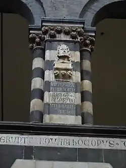 - Büste des Gottes Janus im Mittelschiff mit darunter angebrachter Inschrift „Jan(us) p(ri)m(us) rex Italie de p(ro)genie gigantiu(m) q(ui) fu(n)davit Jan(uam) t(em)p(o)r(e) Abrahe“ („Janus, erster König Italiens, aus der Nachkommenschaft der Giganten, der Janua (= Genua) zur Zeit Abrahams gründete“).[4]