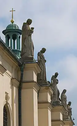 Nur die laternenartigen Aufbauten der Westtürme wurden in der den Bewohnern gewohnten Form wieder errichtet. Auch der Kapellenkranz um den Ostchor und entlang des Langhauses zeigt barocke Formen. Auf den Traufkanten der Seitenkapellen stehen auf hohen Pfeilervorlagen Statuen polnischer Heiliger und Seliger, angefertigt in der Werkstatt von M. Rożek in den Jahren 1932 bis 1936.[4]