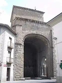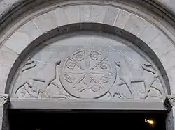 Die beiden Zugänge im Westen und im Süden sind jeweils mit einem Portikus versehen. Der romanische Westportikus wird von zwei großen Gewölben gebildet, die das Mittelschiff nach außen um zwei Joche verlängern. Hier befindet sich ein Tympanon, das – außergewöhnlich – ein Christusmonogramm zeigt. Es könnte sich um das älteste erhaltene romanische Tympanon überhaupt handeln.[14] Das Christusmonogramm steht zwischen zwei Löwen, was auch als Symbol der aragonischen Monarchie gedeutet wird. Nach anderer Deutung stellen die Löwen Christus dar, ein Bild aus der Apokalypse.[15] Der (heraldisch) rechte Löwe steht mit geschlossenem Maul über einem Mann, der eine Schlange fängt. Der (heraldisch) linke Löwe zeigt dagegen seine Zähne und tritt auf einen Bären und einen Basilisken. Begleitend finden sich dazu drei Inschriften in Latein. Die Inschrift, die um das Chrismon läuft, lautet: