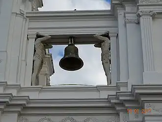 Die breit gelagerte Fassade wird von zwei gedrungen wirkenden seitlichen Glockentürmen (campanarios) gerahmt und stabilisiert. Das Erdgeschoss aller Bauteile ist durch insgesamt sechs Säulen- bzw. Pilasterpaare aufgelockert; im Mittelteil befinden sich drei in der Höhe gestaffelte Portale. Ein Girlandenfries schließt das Erdgeschoss nach oben ab. Die drei Bauteile darüber (Glockengeschosse der Türme und gerundeter Mittelgiebel) sind voneinander getrennt und nur durch zwei ungewöhnliche, von seitlich stehenden und einen Architrav stützenden Atlanten getragene „Fenster“ miteinander verbunden. Giebel und Turmfronten zeigen ausschließlich Pilaster und enden mit zahlreichen steinernen Ziervasen.