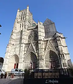 Nur der 60 Meter hohe Nordturm der Kathedrale (gegenüber 69 Meter für Notre-Dame de Paris) ist fertiggestellt worden; der südliche war aus Holz gebaut worden, um die Glocken vorübergehend aufzunehmen. Er wurde schließlich nicht demontiert und wird als Schwarzer Turm bezeichnet. In der Mitte der Fassade befindet sich ein großes Flamboyant-Rosettenfenster aus der zweiten Hälfte des 15. Jahrhunderts.