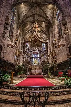 Auch der berühmte Architekt Antoni Gaudí steuerte durch seine Restaurierungs- und Dekorationsarbeiten in den Jahren 1904 bis 1914 auf Initiative des Bischofs Campins seine Kunst im Stil des katalanischen Modernisme (Jugendstilrichtung) bei. Gaudí nahm auch einschneidende bauliche Veränderungen vor: der Chorraum wurde aus der Mitte des Kirchenschiffs verlegt und in die Königskapelle eingegliedert; der Stuhl des Bischofs, aus dem 14. Jahrhundert, wurde erneuert und die Gläubigen erhielten freien Blick auf den Hochaltar.[2] Unter dem Chorgestühl entwarf Antoni Gaudi einen Hohlraum, damit sich der Gesang, auch ohne Mikrofone, in der gesamten Kathedrale verbreiten kann. Der Raum ist mannshoch und agiert wie ein Resonanzkasten. Erst etwa 100 Jahre danach, bei Renovierungsarbeiten, wurde der Hohlraum wiederentdeckt.[3]